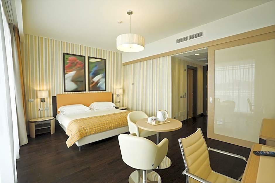 Superior Room has a 50-inch TV with SKY package, air conditioning, Wi-FI connection, slippers, bathrobe, electric kettle. The Superior Room is located on the highest floors of the structure and has a balcony equipped with a table and chairs.