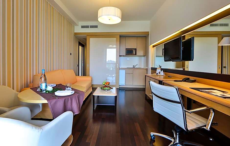 The Junior Suite room consists of a sleeping area with a double bed and a living area with a sofa. Offers a spacious balcony with table and chairs. Inside you will find slippers, bathrobe, electric kettle, air conditioning, Wi-FI connection.